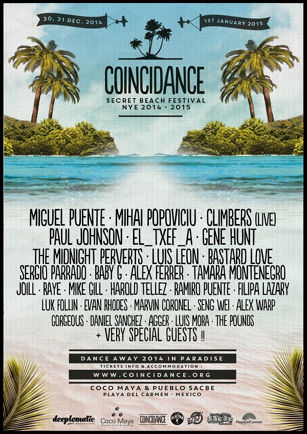 Coincidance Secret Beach Festival es un festival de 3 días y 3 noches: 30 y 31 de Diciembre y 1 de Enero, y se llevará a cabo en la espectaculares playas de la Riviera Maya Mexicana, Playa del Carmen, ya considerada como la Ibiza Mexicana. Despide al 2014 y recibe al 2015 bailando la música de los artistas especialmente seleccionados para tan especial ocasión.