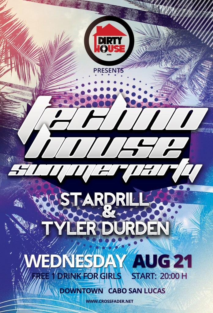 Dirty House Music presenta Techno House Summer Party DJ STARDRILL & TYLER DURDEN 1 bebida gratis para las chicas No Cover Inicio 8PM www.crossfader.net
