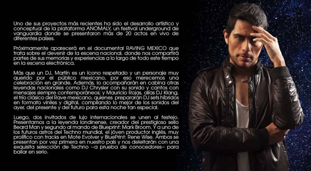 Más que un DJ, Martín es un ícono respetado y un personaje muy querido por el público mexicano, por eso merecemos una celebración en grande. Además, lo acompañarán en cabina otras leyendas nacionales como Dj Chrysler , con su sonido y cantos con mensajes siempre contemporáneos; y Mauricio Rojas, alías Dj Klang, el trío clásico del Rave mexicano, quienes prepararán DJ sets híbridos en formato viniles y digital, compilando lo mejor de los sonidos del ayer, del presente y del futuro para esta noche tan especial.