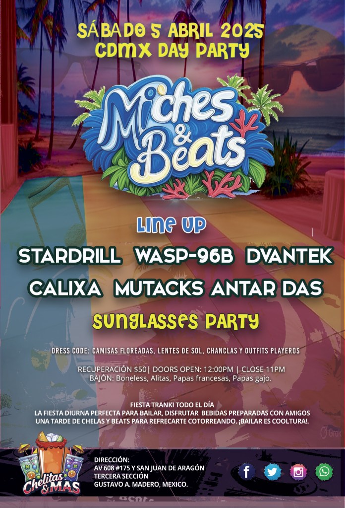 Miches & Beats no es solo una fiesta; es una celebración de la música, la amistad y el buen rollo. Una tarde llena de beats, chelas y diversión que no te puedes perder.